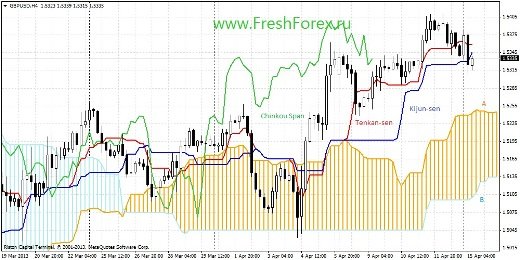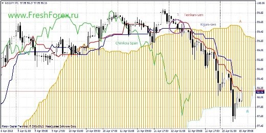 Общим выводом модно считать падение цены, причем тренд разворачивается на нисходящий. Можно войти в рынок и ожидать падения примерно на 60 пунктов. Для входа в долгосрочную сделку, ожидаем разворот облака и пробой ценой облака.