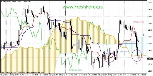 Цена снова изменила направление и тренд. Тенкан пересеклись с Киджун «золотым крестом» (2), что указывает на рост цены. Облако развернулось и направлено на рост. Цена пробила Тенкан и движется вверх (1). Неожиданный разворот тренда в противоречии сигналам. Чинкоу спан снова пересекла цену, снизу вверх говоря о росте. Цена находится выше линии Тенкан и линии Киджун, указывая так же на рост.