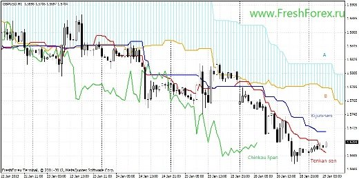 Сигналы индикатора: Линия Тенкан по-прежнему находится ниже линии Киджун. Линии под облаком. Облако развернуто на движение цены вниз. Но цена пересекла Тенкан снизу вверх, что говорит о флете на рынке. Краткосрочный прогноз: На данный момент движение цены вниз приостановлено, так как цена пересекла Тенкан. На рынке флет.