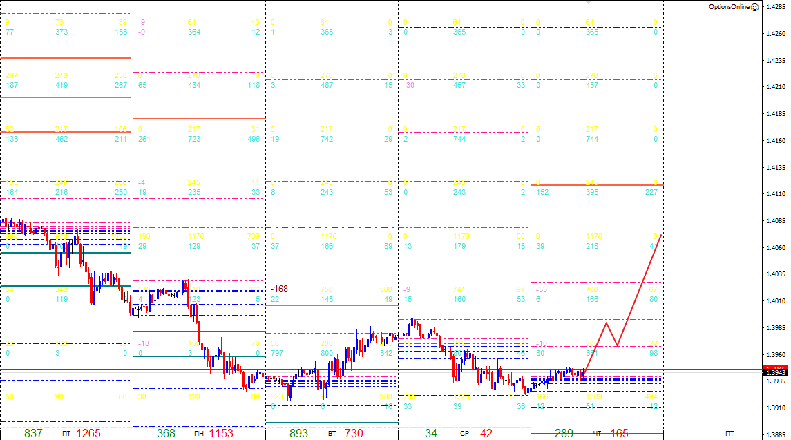 Недельные контракты торгуются у зоны убытков маркетмейкера. Баланс дня на уровне 1.3937, цена торгуется выше его. Доминирующие силы у продавцов, но с очень небольшим перевесом и незначительным объёмом. Граница убытков на уровне 1.3921.