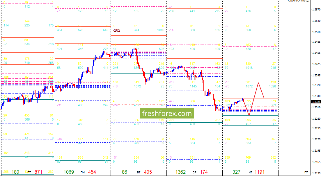 Месячные опционные контракты торгуются в зоне комфорта ниже уровня максимальной прибыли 1.2400. Образованно 2297 контрактов продавцов. Цена на данный момент в балансе дня, где выход за его приделы, может спровоцировать новый нисходящий импульс, вплоть до аномального контракта на уровне 1.2222. Сопротивление для роста находится на уровне 1.2376, с максимально проторгованным объёмом. Доминирующие силы на стороне продавцов.