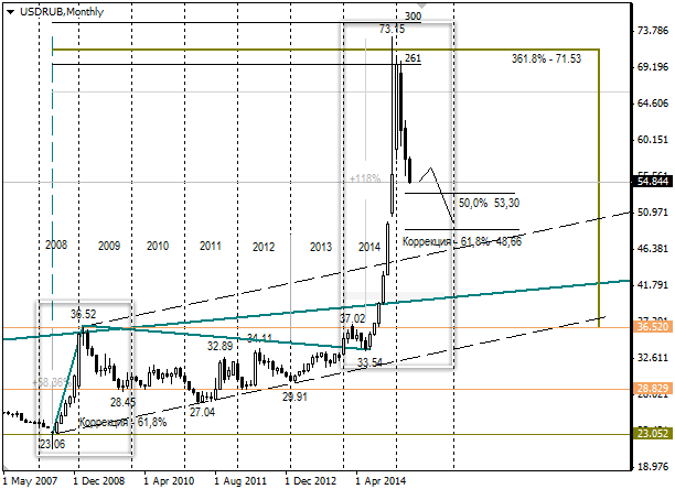 Хочу обратить Ваше внимание на то, что летом в 2009 году доллар/рубль находился в боковом тренде. В 2015 году в июле должны пересмотреть санкции. Если ЕС санкции продлит, значит доллар/рубль повторит динамику 2009 года. После чего продолжит падение к 61,8%.