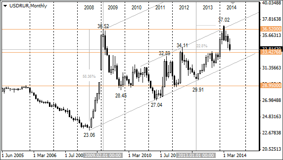 Ниже приведены два месячных графика. По ним видно поведение рублёвых пар с 2005 года. Сейчас ситуация очень схожа с 2009 годом, когда рубль сильно упал в январе месяце. После чего с максимума 36,52 курс доллара снизился к концу года до 28,45, а курс евро скорректировался до 37,02 к июню 2010 года.