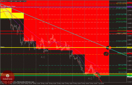 Вчера, 31.05.12, GBP/USD, пробив сильный уровень поддержки 1,5466 (Previously Monthly Volume), снизилась до значения 1,5359, остановившись на границе восходящего наклонного канала (Weekly), защищающего движение вверх. Таким образом, продолжилось формирование медвежьей волны А,С (Н1), в волне А,С (Н4)-А,С/В (Daily) вниз. При пробое и закреплении цены ниже значения 1,5374 (Closing Price), ожидаем дальнейшего снижения валютной пары по уровням поддержки, вплоть до защитного пивота 1,5232 (Daily). Скользящие средние 233, 55 и 21 раскрыты и направлены вниз – медвежья тенденция. Пока не пробита граница нисходящего наклонного канала (Н1), медвежья тенденция сохраняется.