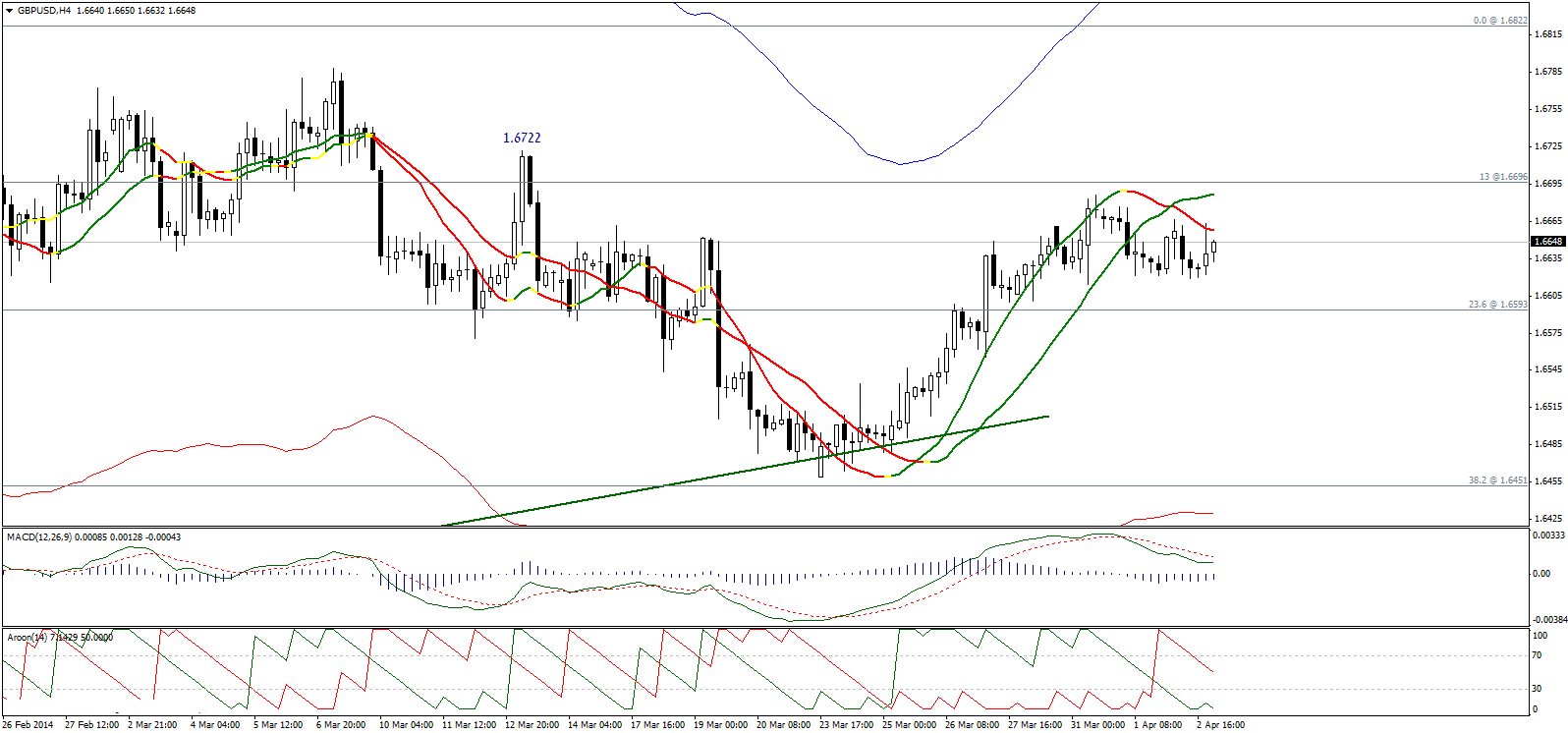 Пара колеблется в рамках небольшого бокового диапазона ниже линий Линейной регрессии 34 и 55, а учитывая отрицательные MACD и AROON, более вероятен медвежий сценарий. Имейте ввиду, что пробой уровня 1,6722 вызовет резкий рост пары и отменит медвежий сценарий.
