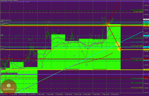Вчера, 07.02.12, EUR/USD, пробив защитный пивот 1,3232 (Н4), выросла до значения 1,3269. В результате чего была сформирована медвежья коррекционная волна В (Н1), а также восходящий наклонный канал (Н4), защищающий движение вверх и в настоящее время идет формирование бычьей волны А,С (Н1), в волне А,С (Н4)-А/В (Daily) вверх. При пробое и закреплении цены выше значения 1,3260 (Daily pivot), ожидаем роста валютной пары по уровням сопротивления, вплоть до значения 1,3467 (Previosly Monthly Volume). Скользящие средние 233, 55 и 21 раскрыты и направлены вверх – бычья тенденция. Пока не пробита граница восходящего наклонного канала (Н4), бычья тенденция сохраняется.