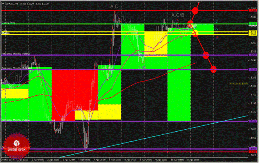 Вчера, 10.04.13, GBP/USD продолжила коррекционное движение и двигалась в рамках флета 1,5342-1,5292. Таким образом, продолжилось формирование бычьей неопределенной волны А,С/В (Н1). При пробое и закреплении цены выше значения 1,5329 (Closing Price), ожидаем роста валютной пары по уровням сопротивления, вплоть до значения 1,5467 (Previously Monthly Volume). Скользящие средние 233, 55 и 21 раскрыты и направлены вверх – бычья тенденция.