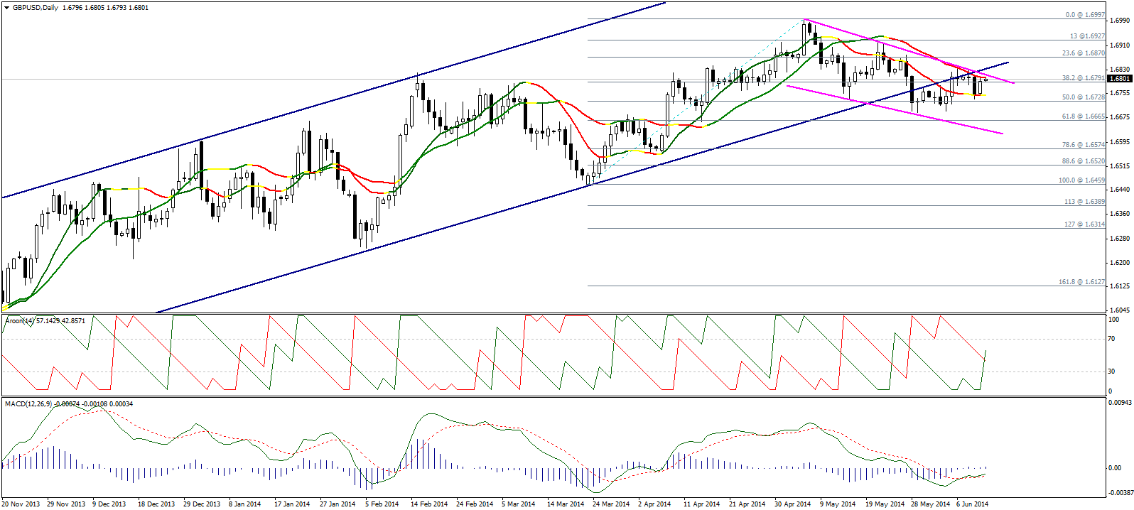 Пара показывает положительную динамику приближаясь к области сопротивления 1,6800/35, пробой которой приведет к дальнейшему росту. С другой стороны, неспособность пробить данную область приведет к новой медвежьей волне. Мы предпочитаем оставаться вне рынка.