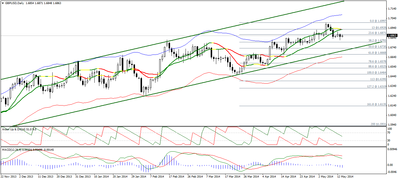 Вчерашнее снижение было остановлено уровнем 1,6820, пробой которого необходим для дальнейшего снижения. Учитывая отрицательные линии Линейной регрессии и торговлю ниже уровня 1,6870, сегодня мы ожидаем дальнейшее снижение, для подтверждения которого необходим прорыв области поддержки 1,6800/20.