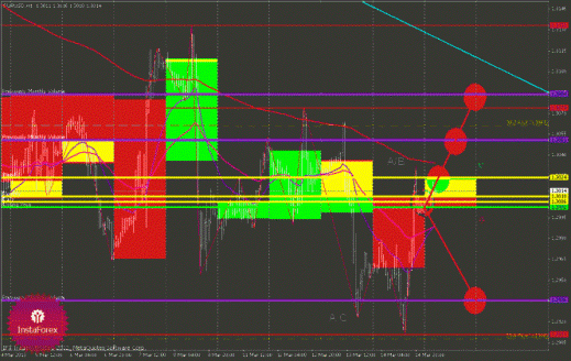Вчера, 14.03.13, EUR/USD корректировалась по отношению к предыдущему снижению и, отскочив от значения 1,2936 (Previously Monthly Volume), выросла до уровня 1,3032. В результате чего была сформирована медвежья импульсная волны А,С (Н1) и в настоящее время идет формирвоание бычьей неопределенной волны А/В (Н1). При пробое и закреплении цены выше значения 1,3024 (Weekly pivot), ожидаем дальнейшего роста валютной пары по уровням сопротивления, вплоть до значения 1,3084 (Previously Monthly Volume). Скользящие средние 55 и 21 переплелись и находятся ниже тяжелой 233 – флет, нисходящая тенденция.