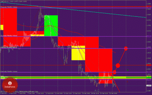 Для похода валюты вверх необходим пробой и закрепление цены выше значения 1,5541 (Previously Monthly Volume), с формированием бычьей волны А/В (Н1).