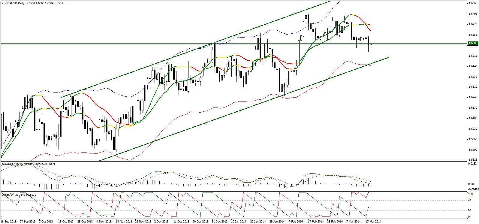 Вчера паре удалось закрыться и стабилизироваться ниже уровня 1,6600, что указывает дальнейшее снижение к уровню поддержки восходящего канала. Данный сценарий так же поддерживают отрицательные MACD и AROON.