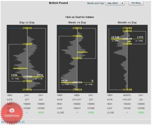 Показатели распределения объемов (Volume Price): В данное время цена находится ниже значений 1,5819 (Monthly pivot), 1,5795 (Daily pivot) и выше 1,5671 (Weekly pivot) – флетовое расположение цены и объемов.