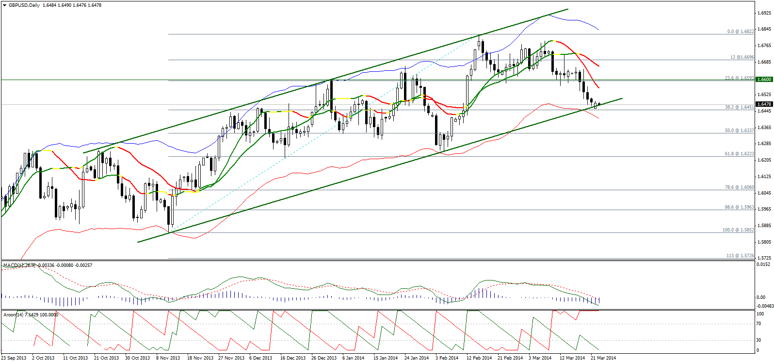 На прошлой неделе пара показала негативную динамику, что привело к стабилизации ниже уровня 1,6600, но учитывая торговлю стабильно выше уровня поддержки восходящего канала 1,6450, для продолжения нисходящего движения необходим прорыв данного уровня. Учитывая негативные линии Линейной регрессии и отрицательные MACD и AROON, данный прорыв видится нам вполне реальным.