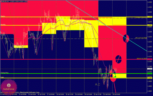 Вчера, 23.07.12, EUR/USD корректировалась по отношению к предыдущему снижению и двигалась в рамках флета 1,2070-1,2147. В результате чего продолжилось формирование медвежьей волны А,С (Н1), в волне А,С (Н4, Daily) вниз. При пробое и закреплении цены ниже значения 1,2105 (Daily pivot), ожидаем дальнейшего снижения валютной пары по уровням поддержки, вплоть до защитного пивота 1,1874 (Weekly). Скользящие средние 233, 55 и 21 раскрыты и направлены вниз – медвежья тенденция. Пока не пробита граница нисходящего наклонного канала (Н4), медвежья тенденция сохраняется.