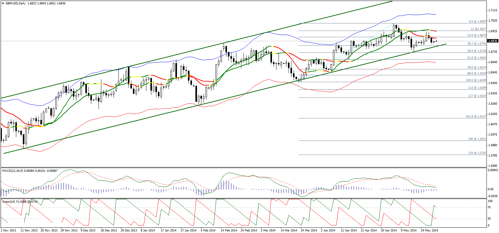 Неспособность пробить важную область сопротивления 1,6920/30 обернулось для пары нисходящим движением со стабилизацией ниже линий Линейной регрессии 34 и 55. Эти факторы указывают на возможность дальнейшего снижения пары на этой неделе, однако учитывая, что торговля по прежнему идет в рамках восходящего канала, для подтверждения негативного разворота нам необходим прорыв его уровня поддержки.