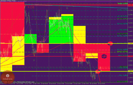 А,В,С – волновой анализ, от них строятся уровни Фибоначчи и точки разворота и продолжения тренда (красные горизонтальный линии).