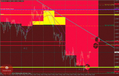 В пятницу, 25.05.12, EUR/USD продолжила нисходящее движение и снизилась до значения 1,2496. В результате чего, продолжилось формирование медвежьей волны А,С (Н1, в волне А,С (Н4, Daily) вниз. При пробое и закреплении цены ниже значения 1,2517 (Daily pivot), ожидаем дальнейшего снижения валютной пары по уровням поддержки. Скользящие средние 55 и 21 переплелись и находятся ниже тяжелой 233 – флет, медвежья тенденция. Пока не пробита граница нисходящего наклонного канала (Н1), защищающего движение вниз, медвежья тенденция сохраняется.