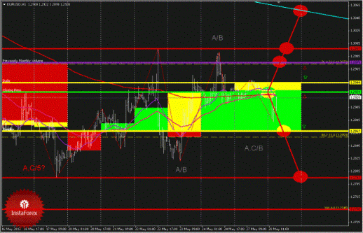 Вчера, 27.05.13, EUR/USD продолжила коррекционное движение и двигалась в рамках флета 1,2915-1,2948. В результате чего была сформирована бычья неопределенная волна А/В (Н1), и в настоящее время идет формирование медвежьей неопределенной волны А,С/В (Н1). При пробое и закреплении цены ниже значения 1,2929 (Closing Price), ожидаем снижения валютной пары по уровням поддержки, вплоть до защитного пивота 1,2795 (Н4). Скользящие средние 233, 55 и 21 переплелись – флет данного уровня.