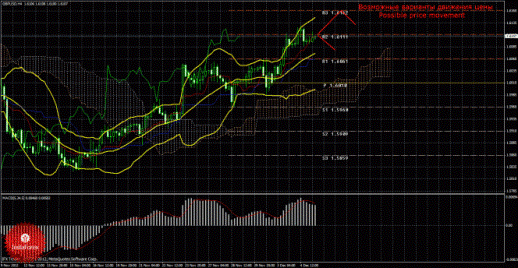 Валютный курс фунта 5 декабря продолжает отрабатывать «золотой крест», полосы Боллинджера начали расширяться наверх, а цена отработала второй уровень сопротивления. Текущий сигнал на покупку – подтвержденный и сильный, так как Чинкоу Спан закрепился выше графика цены, а цена закрепилась выше облака Ишимоку. На данный момент целью восходящего движения является второй уровень сопротивления 1,6111, который уже отработан, но не преодолен. В случае преодоления этого таргета, восходящее движение может продолжиться к третьему уровню сопротивления 1,6162. Восходящее движение сохраняется до тех пор, пока цена находится выше Киджун-сен (1,6160), закрепление цены ниже этой линии ослабит текущий «золотой крест» и поставит под сомнение дальнейшую отработку восходящего движения. Чинкоу Спан находится выше графика цены, что является подтверждением текущему сигналу на покупку и означает бычье настроение валютных трейдеров по этой валютной паре. Боллинджер Бандс показывает восходящее движение, полосы расширяются и направлены вверх, поэтому сейчас рекомендуется рассматривать длинные позиции на рынке. MACD развернулся вниз, что свидетельствует о текущем коррекционном движении, поэтому ордера на покупку можно будет рассматривать после разворота этого индикатора наверх, что обозначит возобновление восходящего движения. Отскок цены от уровня сопротивления 1,6111 спровоцировал начало коррекционного движения.