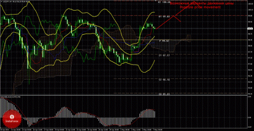 Анализируя курс иены на рынке Форекс 7 мая, видно, что цена не отработала пока что первый уровень сопротивления и начала корректироваться, о чем сигнализирует разворот MACD вниз. Текущий сигнал на покупку является подтвержденным и сильным, так как Чинкоу Спан закрепился выше графика цены, а цена преодолела облако Ишимоку. Поэтому сейчас целью для восходящего движения является первый уровень сопротивления 99,83. В случае преодоления первого таргета, восходящее движение сможет продолжиться с целью второй уровень сопротивления 100,68. Восходящее движение будет актуальным до тех пор, пока цена находится выше критической линии Киджун-сен (98,25), если цена закрепится ниже этой линии, то сигнал на покупку ослабится и может быть отменен и может возобновиться нисходящее движение с целью первый уровень поддержки 97,57. Чинкоу Спан находится выше графика цены, что является подтверждением текущему сигналу на покупку и означает бычье настроение участников рынка по валютной паре доллар/иена. Боллинджер Бандс показывает продолжение восходящего движения, полосы направлены наверх и расширяются, поэтому сейчас актуальными являются длинные позиции. MACD развернулся вниз, что говорит о текущем коррекционном движении, в случае разворота этого индикатора обратно наверх, это может стать сигналом к возможному возобновлению восходящего движения. Отскок цены от пивот уровня 98,42 или Киджун-сен может также спровоцировать завершение коррекции.