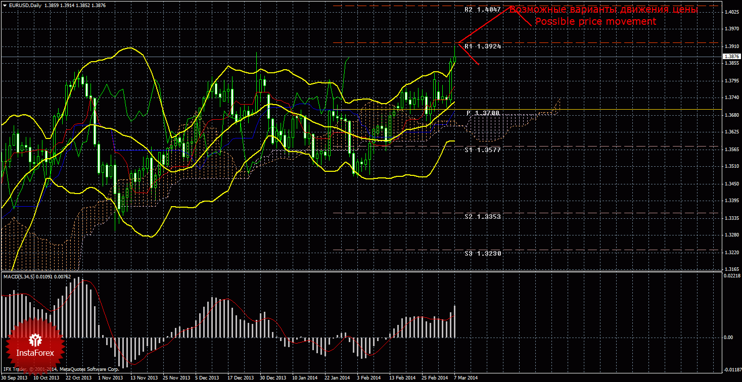 По валютной паре EUR/USD продолжается восходящее движение. Первой целью для торговли на повышение выступает 1,3924. Если произойдет закрепление выше этого таргета, то ордера на покупку можно будет рассматривать с целью 1,4047. Уровень защитного ордера рекомендуется выставлять ниже 1,3690 и в случае повышения Киджун-сен переносить вверх и уровень стопа. При прохождении ценой 100-150 пунктов в нужную сторону, стоп лосс рекомендуется переносить в область безубытка. Закрывать вручную длинные позиции можно будет в случае разворота индикатора MACD вниз или при отскоке цены от уровня 1,3924. Ордера тейк профит при торговле на повышение можно выставлять немного ниже целевых уровней – 1,3905 и 1,4030.