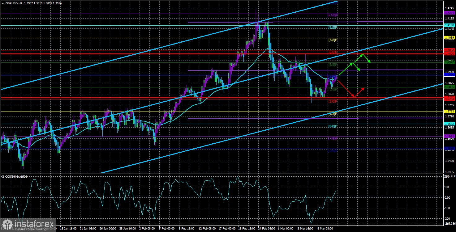 Средняя волатильность пары GBP/USD составляет на данный момент 109 пунктов в день. Для пары фунт/доллар это значение является «высоким». В четверг, 11 марта, таким образом, мы ожидаем движения внутри канала, ограниченного уровнями 1,3802 и 1,4020. Разворот индикатора Хайкен Аши вниз может просигнализировать о новом витке нисходящего движения.