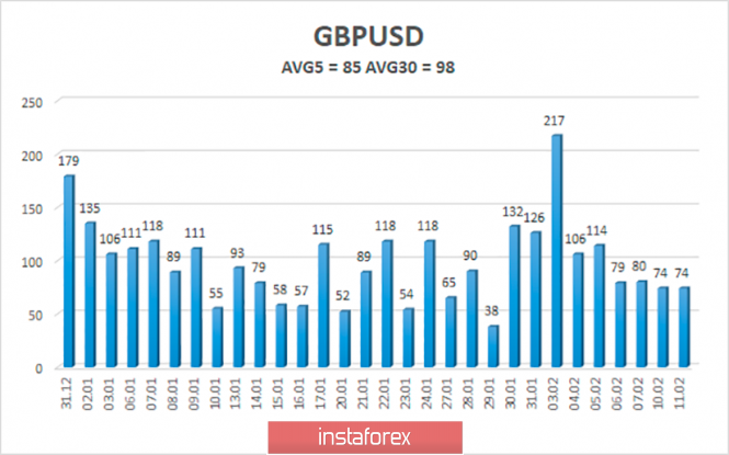 Средняя волатильность пары фунт/доллар за последние 5 дней снизилась до 85 пунктов, а на иллюстрации волатильности четко видно, что показатель продолжает падать. Согласно текущему уровню волатильности, рабочий канал на 12 февраля будет ограничен уровнями 1,2863 – 1,3033. Возобновление движения вниз было бы весьма логичным во вторник, учитывая фундаментальный фон.