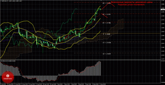 Анализ рынка Форекс по евро за 12 сентября показывает, что цена преодолела облако Ишимоку и закрепилась выше второго уровня сопротивления 1,3293. Текущий сигнал на покупку подтвержденный и сильный, так как Чинкоу Спан закрепился выше графика цены, а цена преодолела облако Ишимоку. На данный момент целью восходящего движения является третий уровень сопротивления 1,3359. В случае закрепления цены выше первого таргета, восходящее движение может продолжиться с целью уровень сопротивления старшего таймфрейма 1,3390. Восходящее движение сохраняется до тех пор, пока цена находится выше Киджун-сен(1,3215), если цена закрепится ниже критической линии, то может попытаться продолжиться нисходящее движение с целью первый уровень поддержки 1,3115, а сигнал на покупку ослабится. Чинкоу Спан находится выше графика цены, что является подтверждением текущему сигналу на покупку и означает бычье настроение трейдеров. Боллинджер Бандс показывает продолжение восходящего движения, полосы расширяются и направлены вверх, поэтому сейчас следует рассматривать ордера на покупку. MACD направлен наверх, что свидетельствует о текущем восходящем движении, если этот индикатор развернется вниз, это может засвидетельствовать начало нисходящей коррекции. Отскок цены от уровня 1,3359 или закрепление ниже уровня 1,3293 также может спровоцировать виток коррекционного движения.