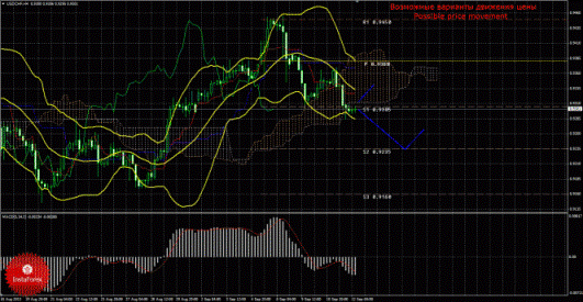 Анализируя курс иены на рынке Форекс 12 сентября, видно, что цена продолжает корректироваться и закрепилась ниже критической линии, чем ослабила «золотой крест». Текущий сигнал на покупку является не подтвержденным и слабым, так как Чинкоу Спан закрепился ниже графика цены, а цена закрепилась внутри облака Ишимоку. Поэтому сейчас целью для восходящего движения является первый уровень сопротивления 100,12, но рассматривать лонги теперь можно будет только в случае обратного закрепления цены выше критической линии Киджун-сен. В случае преодоления первого таргета, восходящее движение может продолжиться с целью – второй уровень сопротивления 101,13. Восходящее движение актуально до тех пор, пока цена находится выше критической линии Киджун-сен (99,55), так как цена сейчас закрепилась ниже Киджун-сен, то «золотой крест» ослаблен и может отмениться, а дальнейшее восходящее движение находится под вопросом, нисходящее движение может продолжиться с целью Сенкоу Спан Б и в ближайшее время может сформироваться сигнал на продажу. Чинкоу Спан находится ниже графика цены, что не является подтверждением текущему сигналу на покупку и означает медвежье настроение участников рынка по валютной паре доллар/иена. Боллинджер Бандс показывает восходящее(!) движение, полосы направлены вверх и расширяются, поэтому сейчас на рынке рекомендуется рассматривать варианты длинных позиций. MACD направлен вниз, что говорит о текущем коррекционном движении, если индикатор поменяет направление своего движения на восходящее, то восходящее движение попытается возобновиться. Отскок от пивот уровня 99,19 или закрепление выше Киджун-сен может спровоцировать завершение глубокой коррекции.
