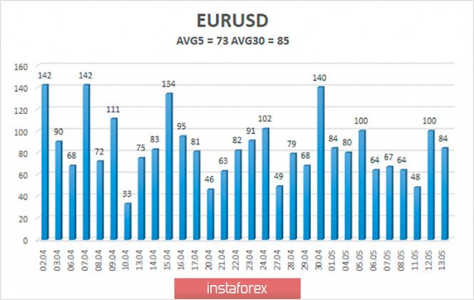 Средняя волатильность валютной пары евро/доллар по состоянию на 14 мая составляет 75 пунктов. Таким образом, показатель остается стабильным, а его значение характеризуется сейчас как «среднее». Сегодня мы ожидаем движение котировок между уровнями 1,0746 и 1,0892. Разворот индикатора Хайкен Аши наверх может просигнализировать о новом витке восходящего движения уже в рамках не канала 1,0750–1,1000, а в рамках канала 1,0777–1,0897.