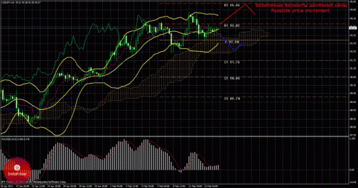 Анализируя курс иены на рынке Форекс 14 февраля, видно, что цена отработала облако Ишимоку, но закрепиться внутри него не смогла, поэтому может возобновиться восходящее движение или начаться боковое. Текущий сигнал на покупку является неподтвержденным и сильным, так как Чинкоу Спан находится ниже графика цены, а цена располагается выше облака Ишимоку (пока что). Поэтому сейчас целью для восходящего движения является первый уровень сопротивления 93,82. В случае преодоления первого таргета восходящее движение сможет продолжиться с целью второй уровень сопротивления 94,96. Восходящее движение актуально до тех пор, пока цена находится выше критической линии Киджун-сен (93,30), если цена закрепится ниже этой критической линии, то может продолжиться нисходящее движение к нижней границе облака Ишимоку, а сигнал на покупку ослабится. Чинкоу Спан находится ниже графика цены, что не является подтверждением текущему сигналу на покупку и означает медвежье настроение участников рынка по валютной паре доллар/иена. Боллинджер Бандс показывает боковое движение, полосы не расширяются и направлены вбок, поэтому сейчас следует предельно осторожно заходить в рынок или не заходить вообще. MACD развернулся наверх, что говорит о текущем восходящем движении, поэтому лонги сейчас актуальны, но цена может продолжить движение в боковом канале. Если цена закрепится внутри облака Ишимоку, то нисходящая коррекция продолжится к Сенкоу Спан Б.