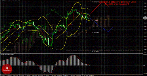 Анализ рынка Форекс по евро за 14 августа показывает, что цена продолжает отрабатывать «мертвый крест» и отработала первый уровень поддержки, который пока что не смогла преодолеть. Текущий сигнал на продажу подтвержденный и сильный, так как Чинкоу Спан закрепился ниже графика цены, а цена располагается ниже облака Ишимоку. На данный момент целью нисходящего движения является первый уровень поддержки 1,3248, который уже отработан ценой. В случае закрепления цены ниже первого таргета, нисходящее движение может продолжиться с целью второй уровень поддержки 1,3156. Нисходящее движение сохраняется до тех пор, пока цена находится ниже Киджун-сен (1,3315), если цена закрепится выше критической линии, то цена может попытаться возобновить восходящее движение с целью первый уровень сопротивления 1,3416, а сигнал на продажу ослабится. Чинкоу Спан находится ниже графика цены, что является подтверждением текущему сигналу на продажу и означает медвежье настроение трейдеров. Боллинджер Бандс показывает продолжение нисходящего движения, полосы немного расширяются и направлены вниз, поэтому сейчас следует рассматривать ордера на продажу. MACD направлен вниз, что свидетельствует о текущем нисходящем движении, разворот индикатора наверх (может случиться уже на текущей свече) может просигнализировать о возможном возобновлении восходящего движения или о начале восходящей коррекции. Отскок цены от уровня 1,3248 также может спровоцировать восходящий откат.