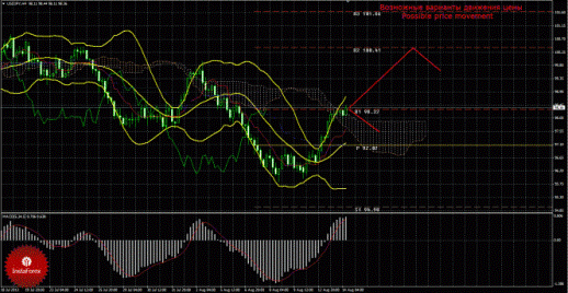 Анализируя курс иены на рынке Форекс 14 августа, видно, что цена сформировала новый сигнал на покупку, преодолела облако Ишимоку и отработала первый уровень сопротивления. Текущий сигнал на покупку является подтвержденным и сильным, так как Чинкоу Спан находится выше графика цены, а цена располагается выше облака Ишимоку. Поэтому сейчас целью для восходящего движения является первый уровень сопротивления 98,32, который уже отработан, но пока что не преодолен. В случае преодоления первого таргета, восходящее движение может продолжиться с целью – второй уровень сопротивления 100,41. Восходящее движение актуально до тех пор, пока цена находится выше критической линии Киджун-сен (97,10), если цена закрепится ниже Киджун-сен, то «золотой крест» ослабится и может отмениться, а восходящее движение поставится под вопрос, в этом случае может возобновиться нисходящее движение с целью первый уровень поддержки 94,98. Чинкоу Спан находится выше графика цены, что является подтверждением текущему сигналу на покупку и означает бычье настроение участников рынка по валютной паре доллар/иена. Боллинджер Бандс показывает продолжение восходящего движения, полосы направлены вверх и расширяются, поэтому сейчас на рынке рекомендуется рассматривать варианты длинных позиций. MACD направлен наверх, что говорит о текущем восходящем движении, разворот индикатора вниз может просигнализировать о начале витка нисходящего коррекционного движения. Отскок от уровня 98,32 также может спровоцировать коррекцию.