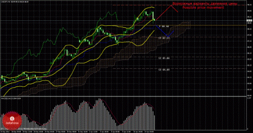 Анализируя курс иены на рынке Форекс 15 января, видно, что началось коррекционное движение к Киджун-сен и пивот уровню 88,48, поэтому пока что длинные позиции не актуальны. Текущий сигнал на покупку является подтвержденным и сильным, так как Чинкоу Спан находится выше графика цены, а цена располагается выше облака Ишимоку. Поэтому сейчас целью для восходящего движения является первый уровень сопротивления 90,13. В случае преодоления этого уровня восходящее движение сможет продолжиться с целью второй уровень сопротивления 91,10. Восходящее движение будет актуальным до тех пор, пока цена находится выше критической линии Киджун-сен (88,50), закрепление цены ниже этой линии поставит под сомнение дальнейшее восходящее движение, а «золотой крест» в свою очередь ослабится. Чинкоу Спан находится выше графика цены, что является подтверждением текущему сигналу на покупку и означает бычье настроение участников рынка по валютной паре доллар/иена. Боллинджер Бандс показывает восходящее движение, полосы немного сужаются и направлены вверх, поэтому сейчас рекомендуется рассматривать только торговлю на повышение. MACD направлен вниз, что говорит о текущем коррекционном движении, поэтому новые ордера на покупку будут актуальны после разворота этого индикатора наверх. Отскок цены от пивот уровня 88,48 может спровоцировать возобновление восходящего движения.