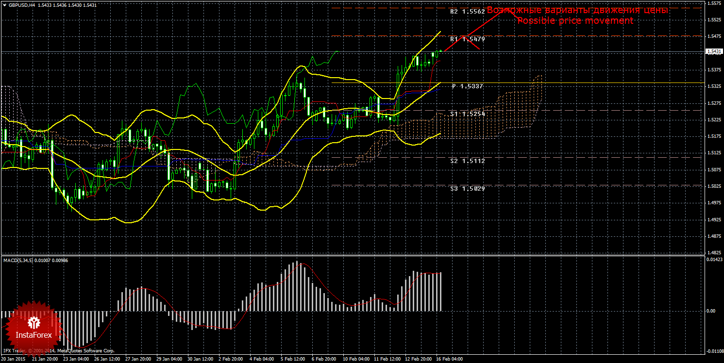 Валютный курс фунта 16 февраля продолжает восходящий тренд без признаков начала нисходящей коррекции. Текущий сигнал на покупку подтвержденный и сильный, так как Чинкоу Спан закрепился выше графика цены, а цена располагается выше облака Ишимоку. На данный момент целью восходящего движения является первый уровень сопротивления 1,5479. В случае преодоления первой цели, новым таргетом будет выступать второй уровень сопротивления 1,5562. Восходящее движение является актуальным до тех пор, пока цена находится выше Киджун-сен (1,5315), если цена закрепится ниже критической линии, сигнал на покупку будет ослаблен, а продолжение восходящего движения будет поставлено под вопрос, нисходящее движение в этом случае может продолжиться с целью первый уровень поддержки 1,5254, а длинные позиции потеряют свою актуальность. Чинкоу Спан находится выше графика цены, что является подтверждением текущего сигнала на покупку и означает "бычье" настроение валютных трейдеров по этой валютной паре. Боллинджер Бандс показывает продолжение восходящего движения, полосы расширяются и направлены вверх, поэтому сейчас на рынке актуальны ордера на покупку. MACD направлен вверх, что сигнализирует сейчас о текущем восходящем движении цены, если индикатор развернется вниз, это будет означать виток коррекционного движения. Отскок цены от уровня сопротивления 1,5479 также может засвидетельствовать начало коррекции.