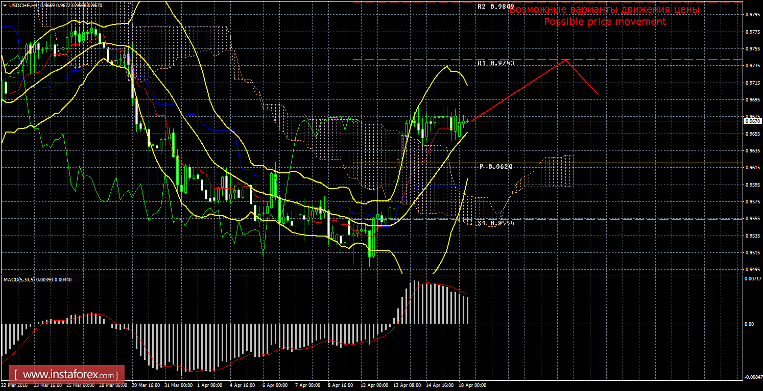18 апреля пара доллар/франк продолжает ослабившееся восходящее движение, а индикатор MACD продолжает разряжаться. Текущий сигнал на покупку подтвержденный и сильный, так как линия Чинкоу Спан находится выше графика цены, а цена располагается выше облака Ишимоку. Сейчас целью для восходящего движения является первый уровень сопротивления 0,9743. При преодолении первой цели, новым таргетом для восходящего движения станет второй уровень сопротивления 0,9809. Восходящее движение имеет перспективы до тех пор, пока цена находится выше линии Киджун-сен (0,9590), если цена закрепится ниже этой линии, то текущий сигнал будет ослаблен, дальнейшее восходящее движение будет поставлено под вопрос, нисходящее движение сможет возобновиться с целью первый уровень поддержки 0,9554, а длинные позиции потеряют свою актуальность. Чинкоу Спан находится выше графика цены, что является подтверждением текущего сигнала на покупку и означает «бычье» настроение участников рынка по валютной паре доллар/франк. Боллинджер Бандс показывает продолжение восходящего движения, полосы сужаются и направлены вверх, поэтому сейчас на рынке актуальны лонги. MACD развернулся вниз, что сигнализирует о текущем нисходящем движении, однако цена сейчас не понижается, соответственно, индикатор разряжается. Отскок цены от первого таргета может спровоцировать нисходящую коррекцию.