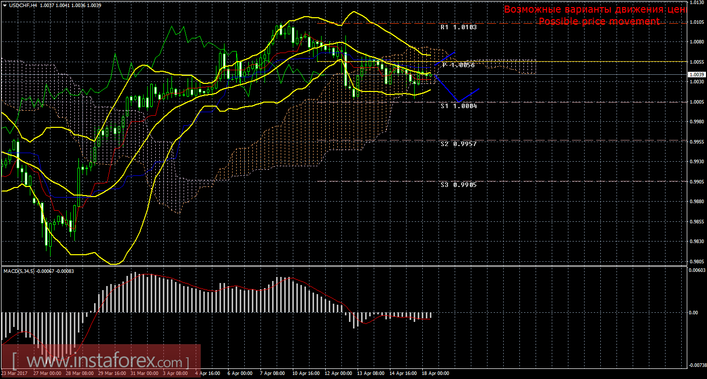 Анализируя пару доллар/франк 18 апреля видно, что цена продолжает отрабатывать новый «мертвый крест» и слабеющее нисходящее движение. Текущий сигнал является подтвержденным и слабым, так как линия Чинкоу Спан закрепилась ниже графика цены, а цена располагается внутри облака Ишимоку. На данный момент целью для нисходящего движения является уровень поддержки 1,0004, но актуальными короткие позиции станут только ниже облака Ишимоку. Следующим таргетом выступает второй уровень поддержки 0,9957. Нисходящее движение имеет перспективы только ниже линии Киджун-сен (1,0050), если цена уйдет выше этой линии, это ослабит текущий «мертвый крест» до предела, а нисходящее движение потеряет свою актуальность. Движение вверх в этом случае сможет возобновиться с целью первый уровень сопротивления 1,0103. Боллинджер Бандс показывает продолжение нисходящего движения, полосы сужаются и направлены вниз, поэтому сейчас на рынке актуальны варианты коротких позиций, но только после усиления текущего сигнала. MACD направлен вверх, что сигнализирует о коррекционном движении цены, если индикатор развернется обратно вниз, это просигнализирует о возможном продолжении движения вниз.