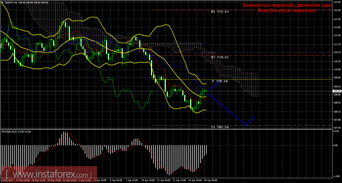 Анализируя пару доллар/иена на рынке Форекс 18 апреля, видно, что цена скорректировалась к критической линии и даже закрепилась чуть выше нее. Текущий сигнал на продажу остается подтвержденным и сильным, так как Чинкоу Спан находится ниже графика цены, а цена располагается ниже облака Ишимоку. Поэтому сейчас целью для движения вниз является уровень поддержки 107,56. Если этот таргет будет преодолен, то новой целью будет выступать уровень поддержки 106,51. Нисходящее движение будет актуально до тех пор, пока цена находится ниже критической линии Киджун-сен (109,00). Если цена закрепится выше Киджун-сен (более уверенно, чем сейчас), это ослабит текущий «мертвый крест», движение вниз – будет отменено, а восходящее движение сможет попытаться продолжиться с целью пивот-уровень 109,56. Ордера на продажу в этом случае станут на некоторое время не актуальными. Боллинджер Бандс показывает продолжение нисходящего движения, полосы немного сужаются и направлены вниз, поэтому сейчас на рынке рекомендуется рассматривать варианты коротких позиций. MACD развернулся наверх, сигнализируя о текущем восходящем движении. Если индикатор сменит направление на нисходящее, это укажет на окончание коррекционного движения.