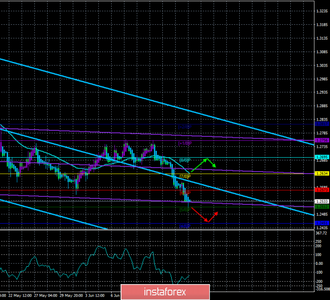 Пара GBP/USD продолжает нисходящее движение, поэтому сегодня, 18 июня, по-прежнему рекомендуется торговать на понижение с целями 1,2512 и 1,2451. Окрас 1-2 баров в фиолетовый цвет просигнализирует о начале коррекции.