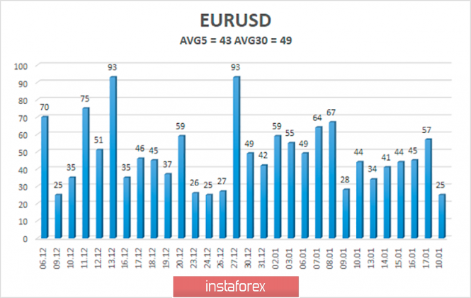 Вторник, 20 января, для валютной пары EUR/USD начинается в слабой нисходящей коррекции. Котировки пары отскочили вчера от уровня Мюррея «3/8» 1,1078, а коррекцию мы ожидали еще в начале дня из-за полувыходного статуса понедельника. Никаких важных и интересных макроэкономических отчетов в течение вчерашнего дня опубликовано не было. Таким образом, значение волатильности 25 пунктов – абсолютно нормальное для такого дня. Теперь трейдерам рекомендуется ждать завершения текущей коррекции для возобновления торговли на понижение. Цель коррекции – скользящая средняя линия.