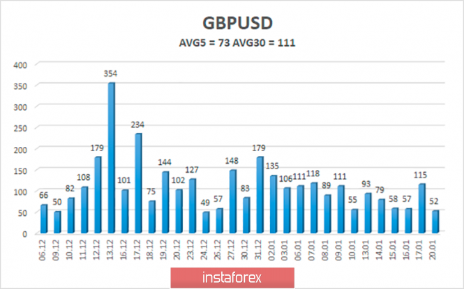 Средняя волатильность валютной пары евро/доллар составляет на текущий момент 43 пункта и вновь снижается. Таким образом, мы имеем уровни волатильности на 21 января 1,1052 и 1,1138. Разворот индикатора Хайкен Аши вниз укажет на завершение коррекционного движения. Во вторник, учитывая нулевой макроэкономический фон, продолжение коррекции весьма вероятно.