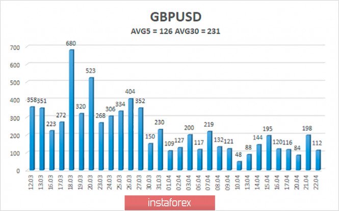 Британский фунт стерлингов 23 апреля в целом продолжает корректироваться против нисходящей тенденции, которая образовалась несколькими днями ранее. Хоть последние бары индикатора Хайкен Аши и окрашены в голубой цвет, мы считаем, что коррекция может продолжиться к скользящей средней линии. В целом мы не можем не отметить слишком резкое снижение фунта стерлингов позавчера, которое даже выглядело как начало новой волны паники на валютном рынке. Однако вчерашние торги показали, что до новой паники еще далеко, а вот начать дорожать американская валюта может вполне свободно. На фоне все той же искренней веры большинства инвесторов и трейдеров в доллар. Хотя мы уже говорили несколько раз, что сейчас британскую валюту ждет практически в любом случае падение, как минимум до уровня 1,1900. Оба варианта, и с «коррекцией против коррекции», и с формированием нового нисходящего тренда, предполагают снижение котировок пары. А фундаментальный фон, который мог бы в обычное спокойное время остановить падение и спровоцировать новое восходящее движение, сейчас на это не способен. И фундаментальный, и макроэкономический фоны продолжают игнорироваться трейдерами. На этой неделе мы уже стали свидетелями этого, когда были проигнорированы все отчеты из Великобритании.