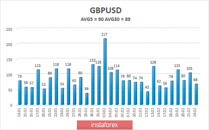 Первый торговый день недели закончился неожиданным ростом европейской валюты. Неожиданным, с фундаментальной точки зрения. На понедельник, 24 февраля, не было запланировано ни одного важного макроэкономического отчета, однако участники рынка все же нашли основания для покупок евровалюты на американской торговой сессии. Мы не считаем, что «коронавирус», который по-прежнему распространяется по планете, может быть причиной для падения американской валюты. Иначе доллар США начал бы дорожать гораздо раньше, когда эпидемия распространялась еще только в Китае и опасения китайских властей были чрезвычайно сильными. Сейчас же, когда известно о нескольких десятках тысячах выздоровевших от вируса, когда стало известно о том, что вирус не такой уж и страшный и в 80-90% случаев полностью излечим, тем более нельзя сказать, что доллар США негативно реагирует на распространение китайского вируса пневмонии. Также вряд ли могло оказать поддержку британской валюте поражение партии Ангелы Меркель на местных выборах в Гамбурге. Или информация о том, что 25 апреля будет избран новый председатель Христианско-демократического союза. Таким образом, мы считаем, что основной причиной укрепления евро является техническая. То есть все та же банальная необходимость сформировать восходящую коррекцию против трехнедельного падения пары. Исходя из этого, мы считаем, что коррекция может продолжиться на этой неделе, но опять-таки вряд ли она будет сильной и быстрой, учитывая средние показатели волатильности евро/доллара.