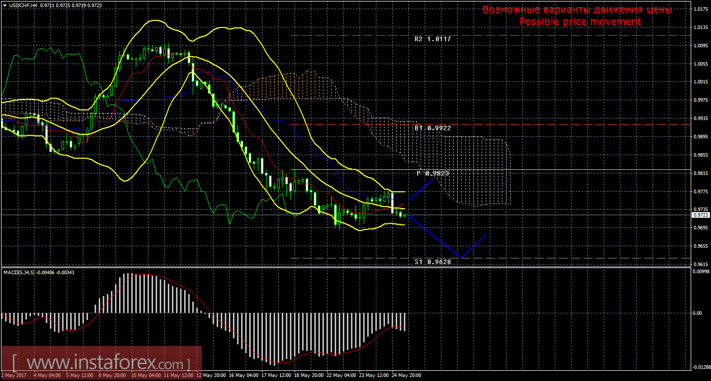 Анализируя пару доллар/франк 25 мая, видно, что цена скорректировалась к линии Киджун-сен и возобновила нисходящее движение. Текущий сигнал является подтвержденным и сильным, так как линия Чинкоу Спан находится ниже графика цены, а цена располагается ниже облака Ишимоку. На данный момент целью для нисходящего движения остается уровень поддержки 0,9628. Следующим таргетом выступает уровень поддержки 0,9529. Нисходящее движение имеет перспективы только ниже линии Киджун-сен (0,9745), если цена уйдет выше этой линии, то «мертвый крест» будет поставлен на грань отмены, а нисходящее движение – потеряет свою актуальность, движение вверх сможет попытаться продолжиться с целью пивот-уровень 0,9823, а шорты на время станут не актуальными. Боллинджер Бандс показывает продолжение нисходящего движения, полосы не расширяются и направлены вниз, поэтому сейчас на рынке по-прежнему актуальны варианты ордеров на продажу. MACD развернулся вниз, что сигнализирует о нисходящем движении цены, разворот индикатора обратно наверх просигнализирует о новом витке коррекции, как и отскок от уровня поддержки 0,9628.