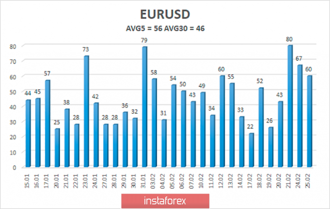 Третий торговый день недели будет особенно скучным в плане макроэкономических событий. Если в первые два дня в распоряжение трейдеров поступали хотя бы второстепенные данные из Германии и США, то в среду не будет даже таких. Несмотря на это, евровалюта не испытывает какого-либо недостатка внимания со стороны трейдеров. Третий день подряд пара евро/доллар хоть и нехотя, но движется вверх. Хоть и с трудом, но преодолевает верхние барьеры. Хоть и не имеет никаких фундаментальных оснований для роста, но все же прибавляет по чуть-чуть. Мы по-прежнему считаем, что текущий рост евровалюты исключительно коррекционный. Факторов, которые могли бы оказать влияние на движение валютной пары, сейчас предостаточно, но абсолютно очевидно, что причиной роста евро сейчас является банальная необходимость скорректироваться после трехнедельного падения, а вовсе не коронавирус и новые опасения замедления мировой экономики из-за него. Тем временем многие эксперты и аналитики считают, что из-за распространения коронавируса и негативных последствий для экономики США ФРС может пойти на снижение ключевой ставки в 2020 году, возможно, даже два раза. Мы считаем, что подобные выводы делать еще слишком рано. Во-первых, экономика США продолжает чувствовать себя в целом хорошо, несмотря на то что, по последним данным, сократились индексы деловой активности в сферах услуг и производства Markit. Во-вторых, коронавирус еще не обрел больших масштабов, чтобы оказывать такое серьезное влияние на экономику. В-третьих, все развитые страны, в том числе и США, взяли курс на борьбу с коронавирусом. В-четвертых, фондовый рынок США обвалился не из-за самого вируса Covid-2019, а из-за опасения инвесторов в замедлении мировой экономики, соответственно и экономики США. Как только ученым и докторам удастся локализовать и нивелировать эпидемию, инвесторы вернут свои капиталы из «тихой гавани» в рисковые активы. Таким образом, падение фондового рынка США временное.