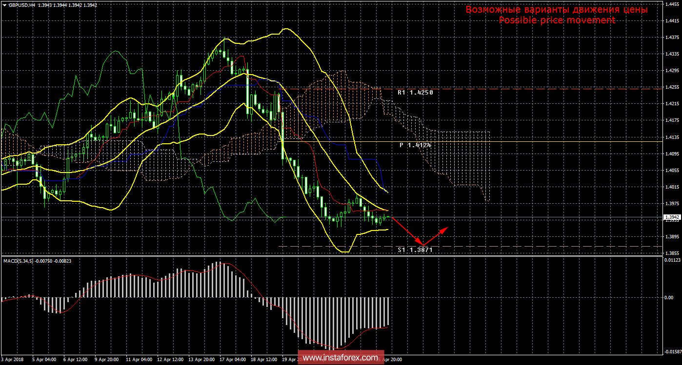 Британский фунт стерлингов довольно быстро закончил очень слабую восходящую коррекцию и возобновил движение вниз. Каких-либо новых фундаментальных оснований для укрепления американской валюты в среду, 25 апреля, не было. Тем не менее, доходность американских ценных бумаг продолжает расти, что вызывает спрос на доллар США для их покупки. Больше объективных причин для роста валюты Штатов сейчас сложно найти. Из макроэкономических отчетов также нечего отметить, так как календарь новостей вчера был абсолютно пустым. Каких-либо выступление Трампа, который очень любит будоражить рынки и делать громкие заявления, тоже не было в последние дни. С технической точки зрения, продолжает отрабатываться сигнал на продажу от Ишимоку, который является сильным. Полосы Боллинджера направлены вниз и сужаются, что свидетельствует о нисходящей тенденции по инструменту. Ордера на продажу сейчас являются доступными для рассмотрения, а целью для движения вниз остается первый уровень поддержки 1,3871. Разворот индикатора MACD вниз может подтвердить завершение восходящей коррекции, однако с реакцией на это индикатор опаздывает. Отскок цены от первого таргета может спровоцировать новый виток коррекционного движения. Средняя волатильность по валютной паре составляет сейчас около 100 пунктов в день.