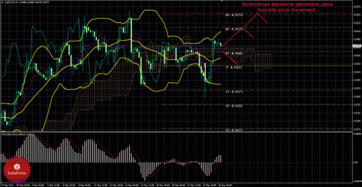 26 марта пара доллар/франк отскочила от первого уровня поддержки 0,9371 и возобновила восходящее движение, также сформировался новый сигнал «золотой крест». Текущий сигнал на покупку – подтвержденный и сильный, так как Чинкоу Спан закрепился выше графика цены, а цена располагается выше облака Ишимоку. Поэтому сейчас целью для восходящего движения является второй уровень сопротивления 0,9525, но отторговывать этот уровень следует предельно осторожно из-за частых смен направления движения валютной пары в последние дни. В случае закрепления цены выше первой цели будет доступен новый таргет для восходящего движения – третий уровень сопротивления 0,9559. Восходящее движение сохраняется до тех пор, пока цена находится выше Киджун-сен(0,9425), если цена закрепится ниже этой критической линии, то нисходящее движение сможет вновь возобновиться к первому уровню поддержки 0,9371, также в этом случае может сформироваться еще один новый «мертвый крест». Чинкоу Спан находится выше графика цены, что является подтверждением текущему сигналу на покупку и означает бычье настроение участников рынка по валютной паре доллар/франк. Боллинджер Бандс показывает возможное продолжение восходящего движения, полосы расширяются и направлены вверх, поэтому актуальными являются длинные позиции. MACD направлен вверх, что сигнализирует о текущем восходящем движении и разрешает сейчас рассматривать лонги до начала новой коррекции, о чем просигнализирует MACD, если развернется вниз. Отскок от уровня 0,9525 может также спровоцировать начало нисходящей коррекции. Если цена закрепится внутри облака Ишимоку или ниже него, это также укажет на коррекцию.