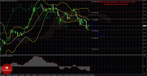 Анализируя курс иены на рынке Форекс 26 марта, видно, что цена продолжила в понедельник нисходящее движение и отработала первый уровень поддержки 93,65, но не смогла преодолеть его. Текущий сигнал на продажу является подтвержденным и сильным, так как Чинкоу Спан находится ниже графика цены, а цена располагается ниже облака Ишимоку. Поэтому сейчас целью для нисходящего движения сейчас является первый уровень поддержки 93,65, который уже отработан, но не преодолен. В случае преодоления этого уровня нисходящее движение сможет продолжиться с целью второй уровень поддержки 92,85. Нисходящее движение будет актуальным до тех пор, пока цена находится ниже критической линии Киджун-сен(94,80), в случае закрепления цены выше Киджун-сен, валютная пара может предпринять еще одну попытку возобновить восходящее движение с первой целью первый уровень сопротивления 95,69. Чинкоу Спан находится ниже графика цены, что является подтверждением текущему сигналу на продажу и означает медвежье настроение участников рынка по валютной паре доллар/иена. Боллинджер Бандс показывает возможное продолжение нисходящего движения, полосы немного расширяются и направлены вниз, поэтому на рынке сейчас рекомендуется рассматривать только варианты коротких позиций. MACD развернулся вниз, что говорит о текущем нисходящем движении, в случае разворота этого индикатора обратно наверх, это может стать сигналом к началу новой восходящей коррекции. Отскок от уровня 93,65, который случился вчера также может спровоцировать начало коррекционного движения.