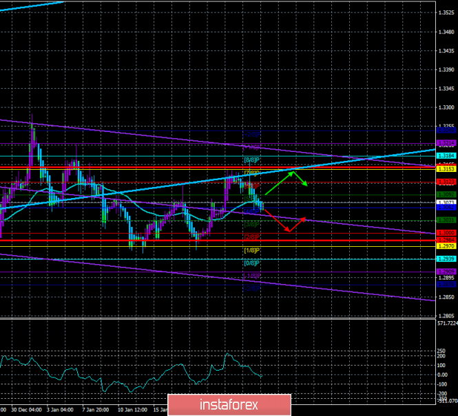 Валютная пара GBP/USD в очередной раз не смогла развить восходящее движение. После отработки уровня Мюррея «7/8» - 1,3153 два раза, быкам так и не удалось преодолеть этот уровень. Вследствие чего вновь возобновилось нисходящее движение, так как пара закрепилась ниже скользящей средней линии. Таким образом, инициатива по паре фунт/доллар вновь в руках медведей. В понедельник, 27 января, никаких важных макроэкономических публикаций в Великобритании и Штатах не будет. Однако на этой неделе состоится заседание Банка Англии, на котором ожидается как минимум увеличение количества членов монетарного комитета, голосующих «за» немедленное понижение ключевой ставки, что само по себе уже является медвежьим фактором. А также состоится то долгожданное событие, которой британский народ ждал в течение последних трех с половиной лет – Brexit. Именно 31 января, то есть в эту пятницу, Великобритания официально начнет Brexit с «переходного периода», а через 11 месяцев, если Борис Джонсон не передумает относительно переноса сроков завершения этого периода, официально покинет Евросоюз. Мы не считает, что начало «переходного периода» может как-то помочь фунту стерлингов. Безусловно, рынки может захлестнуть новая волна эйфории, так как Британия все же «сделала это», однако какие здесь могут быть реальные основания для покупок британской валюты? Страна начинает отдаляться от Евросоюза, в плане отношений с ЕС в течение следующих 11 месяцев для британцев ничего не изменится. Зато начнутся переговоры по торговому соглашению, которое, если будет подписано, вступит в силу 1 января 2021 года. Деньги Великобритания продолжит терять (около 70 млрд долларов в год), соответственно, и макроэкономическая статистика может продолжать ухудшаться.